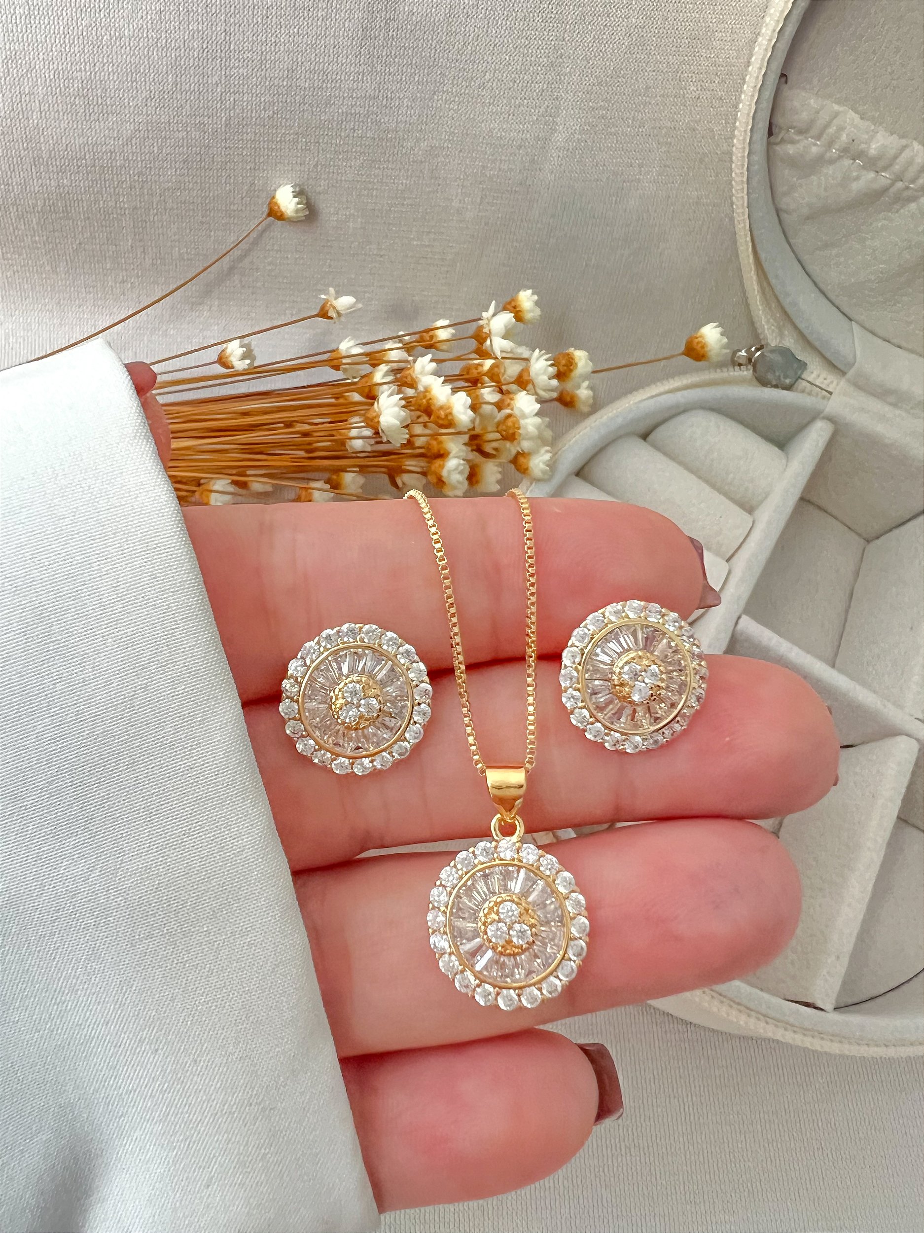 Conjunto Brinco e Colar Pizza banhado a ouro 18k.