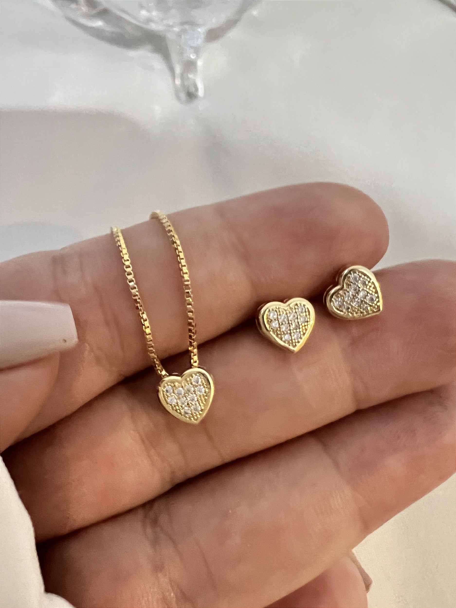 Conjunto de Brinco e colar coração Mini com zircônias cravejadas manualmente banhadas a ouro 18k.